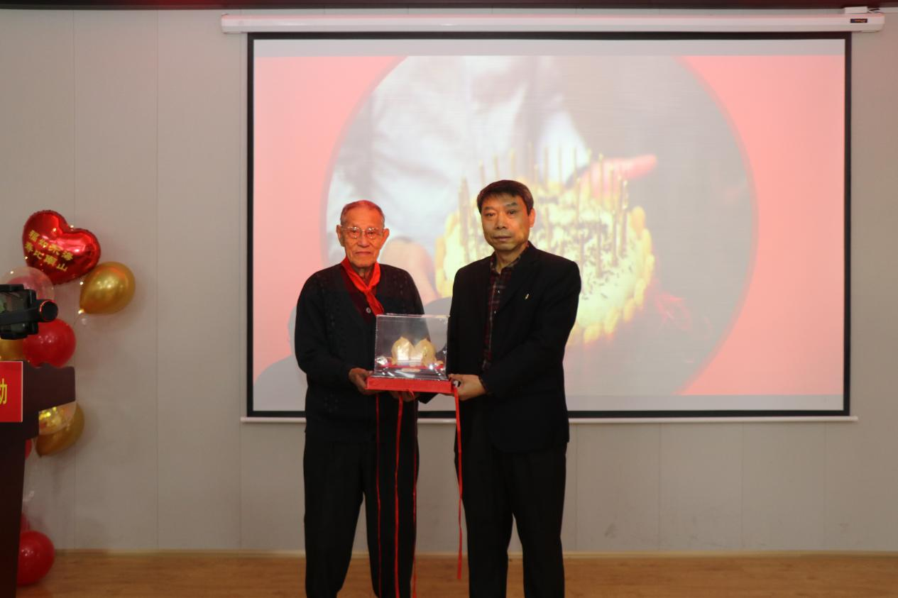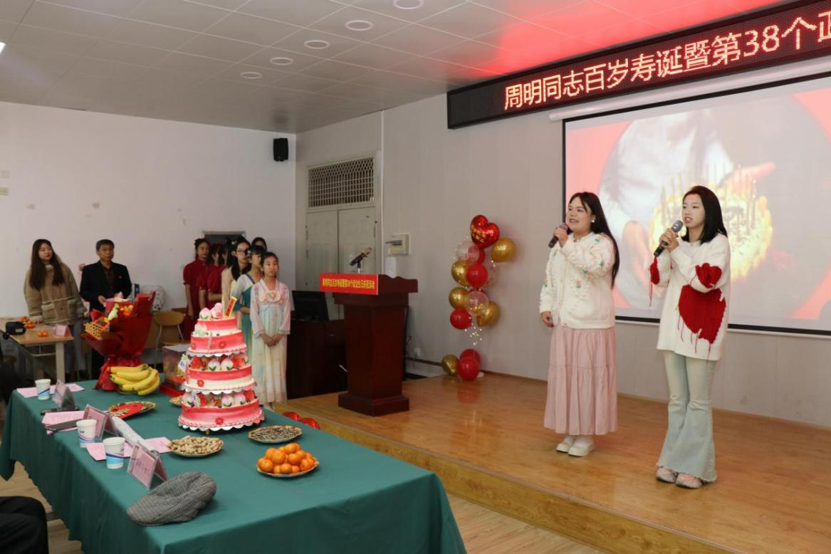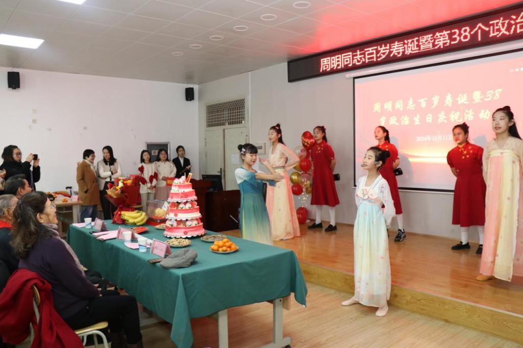 艺术与设计学院学生代表与大路小学的学生代表送上了精彩的文艺节目。之后,周明同志给在场的老师们分享了自己的长寿经验。学校离退休党委委员薛斌修为周明同志送上生日祝福,祝愿周明同志生活之树常绿,生命之水长流,欢乐源长,春晖永驻!