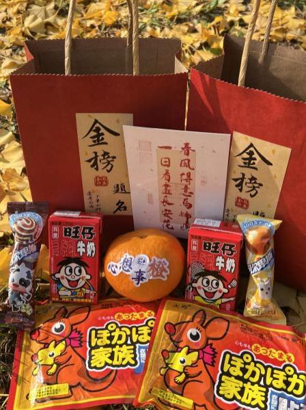 精心准备的考研大礼包中每一份礼物都代表了一份期待。礼包使用红色手提袋包装,寓意“红红火火”,其上印有“金榜题名”的祝福语,鲜嫩可口的橙子寓意心想事“橙”、马到“橙”功;金“棒”题名的棒棒糖;好运“旺旺”的牛奶;“饼肩作战”的小饼干;一张祝福考研学子“信”心百倍的明信片,简短的祝福语激励人心、鼓舞斗志,寄托了对考研学子们成功上岸的美好祝愿。