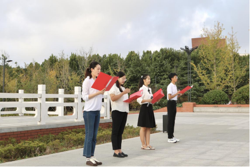 “祖国很大很大,很大很大的祖国。有山的巍峨,河的宽阔,有九百六十万多平方公里的总和。祖国很小很小,很小很小的祖国。在我心上印着,在我舌尖托着。它随着我的呼吸起起伏伏,它随着我的脉搏升升落落。”辅导员杨洪敏、孙楚,学生党员代表亓润雨、2024级新生团员代表宗立盛共同朗诵诗歌《我和我的祖国》,铿锵有力、饱含深情的诵读与祖国不可分割、共同成长的青春誓言。