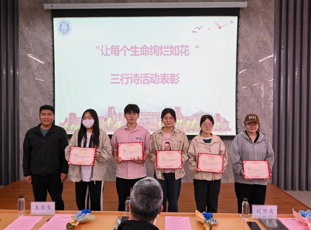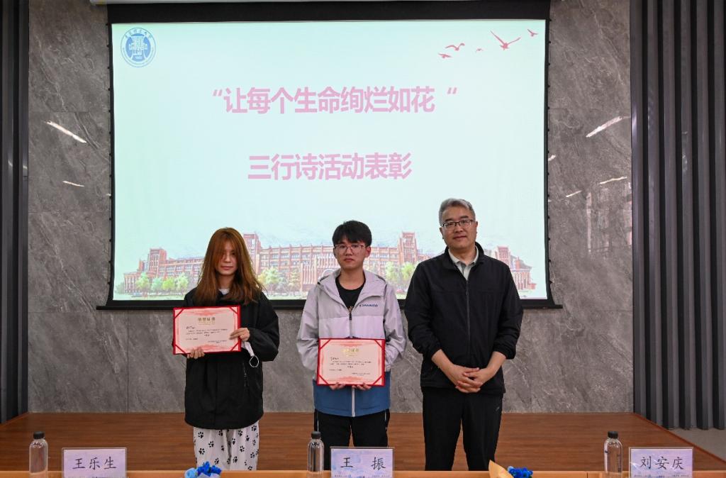 王振、刘安庆为“让每个生命绚烂如花”三行诗的获奖同学颁发荣誉证书。