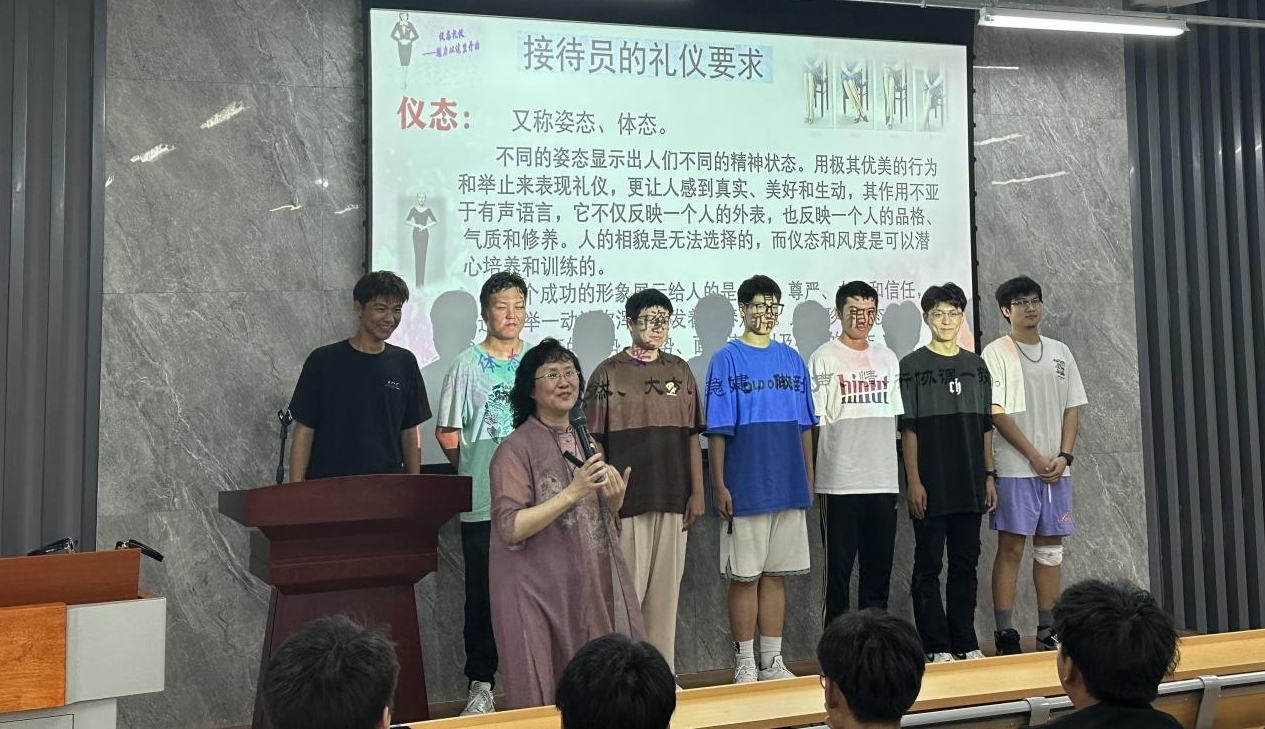 为切实提高校庆志愿者文明礼仪规范水平,潘玲向志愿者详细讲解仪容仪表、礼貌用语、姿态规范等方面的知识,并身体力行,积极互动,为校庆志愿者们示范站姿、走姿、引导手势等规范。
