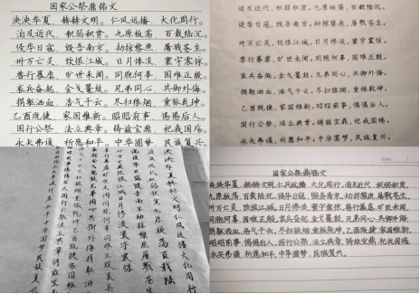 手书铭文汲取力量。商学院学生通过手写自我感悟及手书国家公祭鼎铭文表达自己对逝去同胞的缅怀与敬意,同时对牺牲的烈士和逝世的同胞表达哀思和悼念。同学们以笔寄情,通过书写篆刻在国家公祭鼎上的160字铭文,表达自己对30余万遇难同胞的深深悼念以及对“中华圆梦,民族复兴”的期待,将自己的感恩之心与爱国之情融入自己的作品之中,充分展现了商院学子热爱祖国、奋发图强的精神面貌。