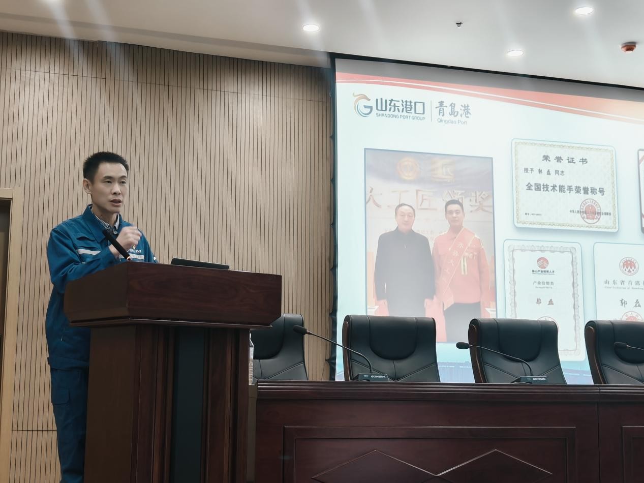 “技能提高没有捷径,所谓“捷径”,就是踏踏实实、一步一个脚印地把自己变专业,将一件事做到极致!”在图书馆报告厅,郭磊滔滔不绝、如数家珍地向同学们介绍着自己的日常工作:“集装箱的四个角有四个长10公分、宽8公分的孔洞,而桥吊的吊具上有四个与之对应的转锁,我的工作就是运用手中的操纵杆装卸集装箱。第一是船舶和货物的安全,第二是装卸的效率。”从一名海军战士到“桥吊”专家,二十多年间日夜的练习和突破,郭磊9次创集装箱装卸世界纪录,独创6项岗位绝活;带领团队获116项专利、完成243项革新,荣获全国技术能手、五一劳动奖章等荣誉,成为青岛港工友口中能文能武,多项全能的“最美港口人”。