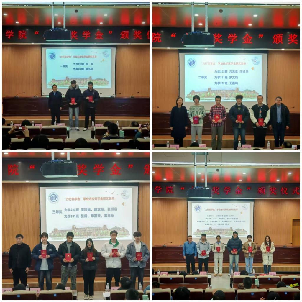 会上,王在泉、范晓光、孔亮、薛诚、缪玉松分别为获得学习进步奖学金的力学222班张毅等12位同学和获得单科奖学金的力学222班赵慜婧等5位同学颁发荣誉证书。