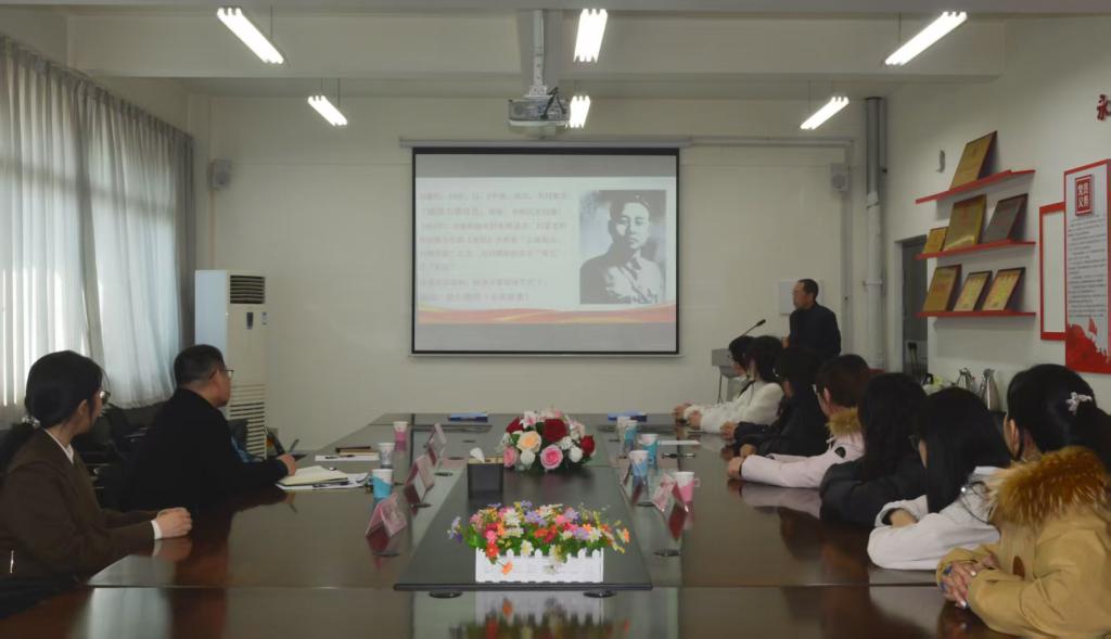 为深入贯彻落实习近平总书记关于“大思政课”建设重要指示精神,深入挖掘和充分利用红色文化资源育人功能,拓宽“大思政课”育人路径,3月19日,平度市刘谦初红色文化园受邀走进人文与外国语学院,在主教学楼A410会议室和图书馆思政研学室开展“红色课堂映初心”活动。学院副院长张成福主持活动,文化中国两创党支部、本科生第一、第二、第三党支部和研究生党支部近百名师生党员参加活动。