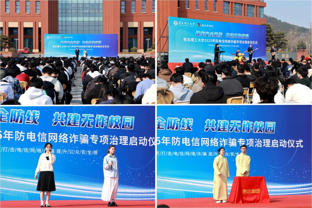 启动仪式亮点纷呈,校大学生艺术团改编《上春山(反诈版)》,思远剧团以相声《一本正经的反诈手册》演绎诈骗套路,市公安局开发区分局357乐队献唱反诈歌曲《new反诈》《向光而行》。
