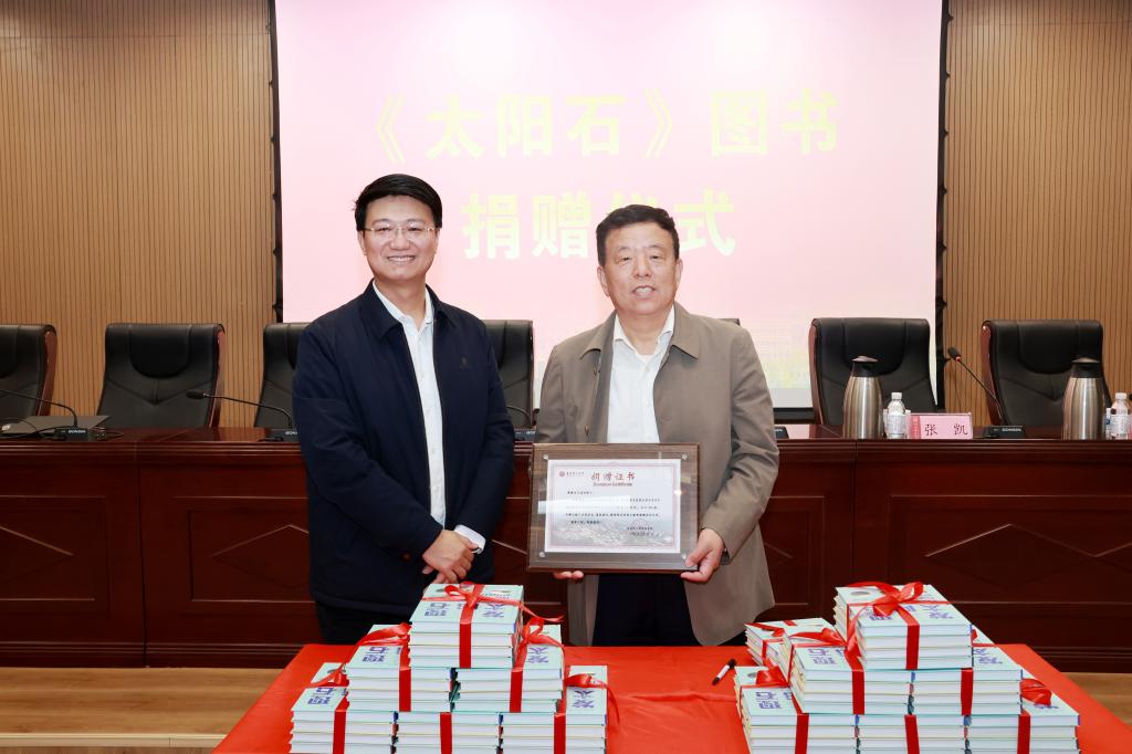 王国法院士向学校师生捐赠了由其主编的《太阳石》(包括《发现太阳石》《开采太阳石》《百变太阳石》《太阳石铸青山》)科普系列丛书100套,并受聘学校发展战略咨询委员会专家。张凯主持捐赠仪式并颁发捐赠证书,图书馆馆长乐国林代表学校接受捐赠。陈连军主持受聘仪式,张凯向王国法院士颁发受聘证书。