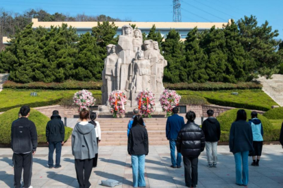 仪式由青岛市革命烈士纪念馆讲解员韩笑主持,奏唱国歌后,全场默哀,所有人庄严肃穆、神情凝重,悼念着为了民族独立和人民解放而英勇牺牲的革命先烈。韩笑为同学们带来了一段慷慨激昂的英魂颂,同学们在“山河魂”烈士群雕前献花缅怀以致敬意。