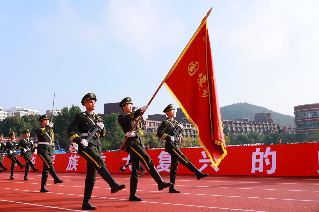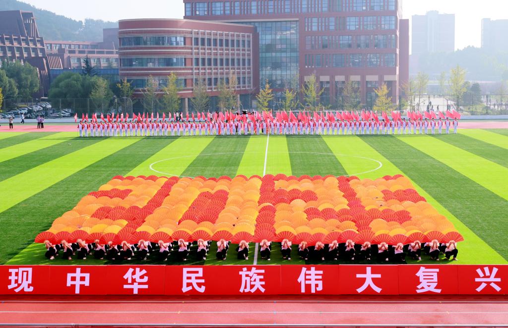 伴随着《我们都是追梦人》激昂的旋律,由体育教学部教师叶明亮、成向荣指导,570余名同学共同呈现的大型团体操《赓续华章》震撼上演。学子们以整齐而富有张力的动作,将勇于追梦的青春朝气与对祖国的赤子之情,融入每一个节拍与姿态之中,充分展现新时代青年昂扬奋进的精神风貌。