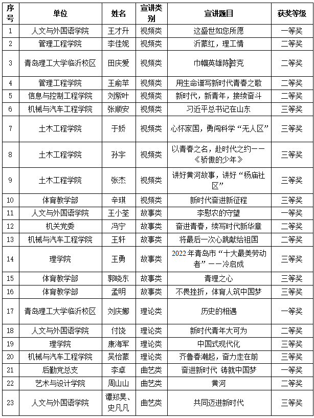 根据《关于在全校开展“中国梦·新时代·新使命”百姓宣讲大赛的通知》要求,经各单位积极组织和专家评审,经研究,评选获奖作品一等奖4名、二等奖8名、三等奖11名,现将获奖名单公布如下。