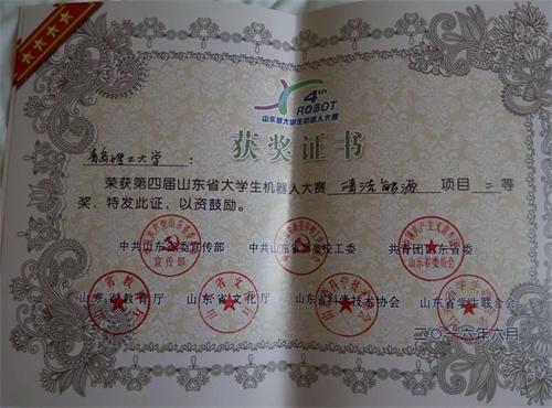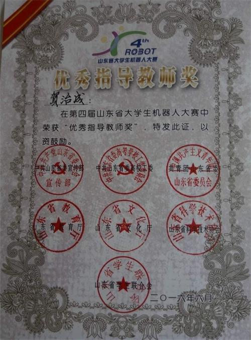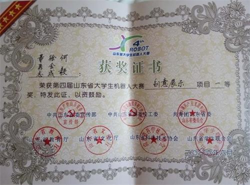 6月4日至5日,由山东省委宣传部、省委高校工委、团省委、省教育厅、省文化厅、省科协、省学联主办,共青团济宁市委、邹城市人民政府承办的第四届山东省大学生机器人大赛在济宁举行。365完美体育首次组队参加该项赛事,两个项目分获一等奖、二等奖。贺治成获优秀指导教师奖。