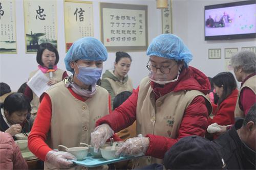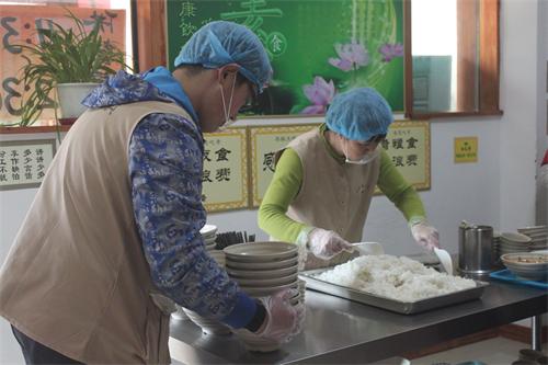 位于大涧山路这家“雨花斋”是一家非营利性、无交易性素食互助餐厅。同学们穿着印有“感恩吃素”的黄色志愿者马甲,双手相握,向客人90度弯腰鞠躬,并为其安排位置。从11点开始,来客陆续增多,有的是清洁工,有的是孤寡老人。午餐时间临近尾声时,同学们还清洗了一批批使用过的餐具。2个小时左右的时间,同学们共为160余人提供了就餐服务。