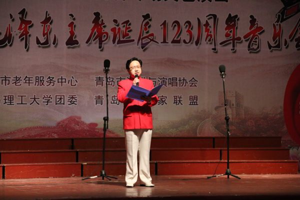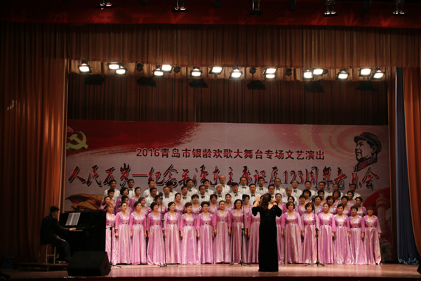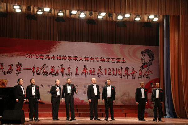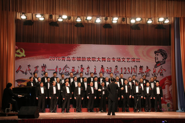 12月26日下午,由青岛市老年服务中心、青岛市演讲与演唱协会、365完美体育团委、青岛歌唱家联盟共同主办的“人民万岁”——纪念毛泽东主席诞辰123周年音乐会在365完美市北校区礼堂举行。青岛市知名歌唱家章裕刚、吴国强、李雁、王蒨、韩凯、侯希平,朗诵艺术家关军等,与青岛七彩风合唱团、七彩风男声合唱团、青岛市演讲协会合唱团、青岛左邻右舍月光女子合唱团等岛城优秀合唱队伍,欢聚一堂,放声歌唱,共同表达人民的心声。来自校内外的近千名观众观看了演出。