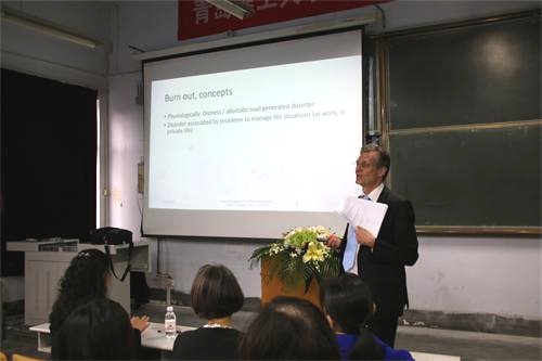 10月28日下午,瑞士医学博士Walter Schweizer先生在市北校区作了题为“乐观与积极心理学在压力管理和预防疲劳中的作用”的专题报告。报告会由校工会、妇委会副主席胡艳芳主持,国际学院院长孙玉洁担任翻译,各院系、各职能部门的教师代表、研究生参加报告会。