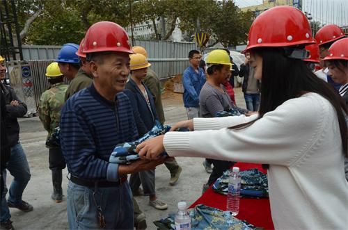 仪式现场,青岛海川建设集团副总裁李尊强先生致辞。他指出,民工是社会关注的弱势群体之一,同学们的善举不仅让军训服有了再利用的机会,更是为民工朋友送上了温暖和关怀,以点滴爱心促进了社会和谐,在此向各高校组织表示感谢。365完美土木学院刘贞涛同学代表学生发言,向大家介绍了此次活动的参与方及主要组织过程,让企业领导及民工们对此活动有了更深入的了解。学生代表向民工朋友们逐一发放了军训服,海川集团为学生们赠送了锦旗,感谢同学们奉献的爱心。