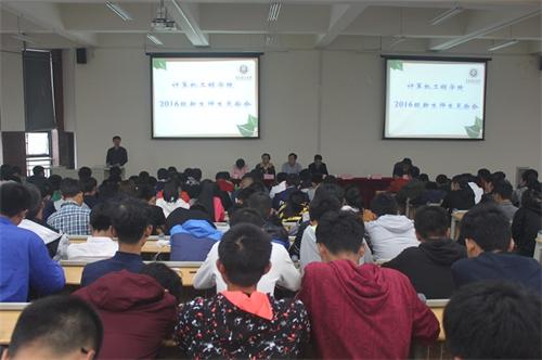 9月28日下午,计算机学院在嘉陵江路校区主教学楼二楼东报告厅举办2016级新生师生见面会。计算机学院院长王斌、党总支书记杨欣虎、党总支副书记魏俊文、各专业教研室主任以及2016级全体新生参加了本次见面会。会议由团总支书记张英华老师主持。