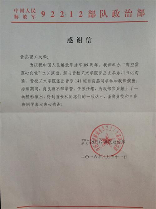 为密切军民鱼水情谊,经艺术学院党总支副书记牟永川沟通,在部队举办的庆祝中国人民解放军建军89周年“海空雷霆心向党”文艺演出中,学院排出音乐141班肖良燕同学参加。排练期间,肖良燕同学不辞辛苦,任劳任怨,展现了理工学子良好的精神面貌和较高的艺术素养。她演唱的《滴答滴》得到了部队官兵的一致认可。