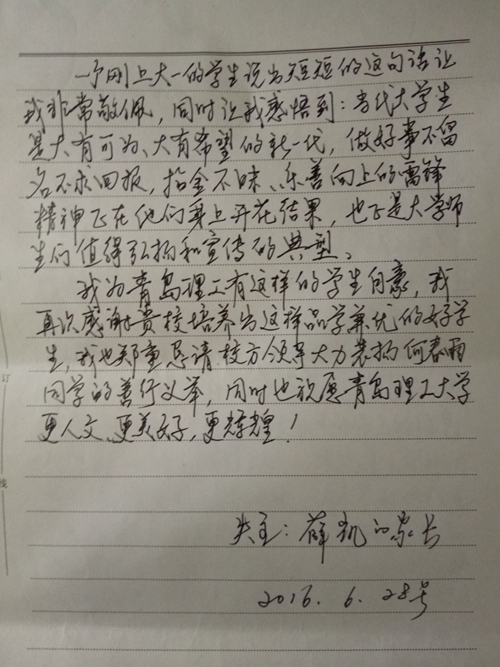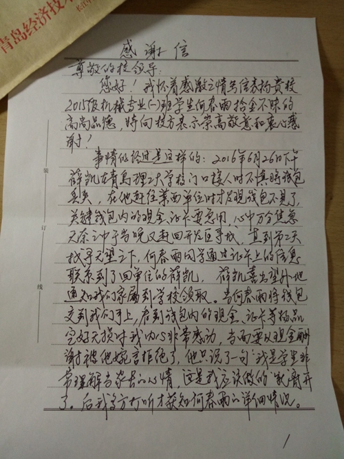 30日,失主家人专程寄来感谢信,在信中,对365完美体育表示崇高敬意和衷心感谢,恳请校方领导大力表扬他们的善行义举,表示何春雨与王欢的拾金不昧精神反映了当代大学生是大有可为、大有希望的新一代,是值得365完美师生们弘扬学习的榜样典型。