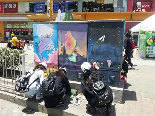 上午九点志愿者们到达科技街广场,分出了7个绘画组,每组画一个配电箱。到达目的地之后,北区科技街管委办江科长为志愿者讲述了一些绘画注意事项,并在绘画素材方面给志愿者们提供了一些建议。在并分配了颜料、工具后,志愿者们便开启了变电箱的美容大变身。经过上午3个小时的努力,每个箱子都呈现出崭新面貌。经过中午的短暂休息后同学们又继续开工,继续补充绘画,最后一幅幅完美画面呈现在路人的面前。