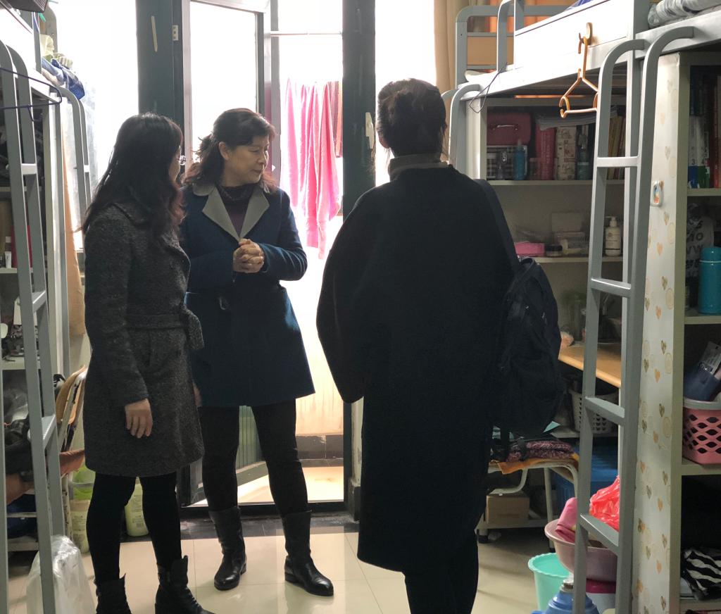 走访中,巩湘红叮嘱学生要勤通风、定时晾晒被褥、做好公寓内卫生清扫工作。王新针对部分宿舍存在的内务不整的问题提出“统一化内务标准”的要求。田洪杰为同学们一一指出待改进卫生死角。