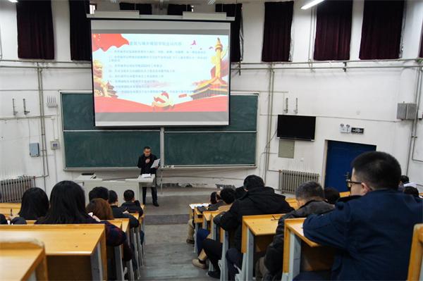 3月21日下午,建筑与城乡规划学院在建筑馆111教室召开全院大会,传达学习贯彻习近平总书记在十三届全国人大一次会议上重要讲话精神和全国两会精神。按照学校党委行政2018年工作要点要求,部署学院各项工作。学院全体教职员工参加会议,会议由党总支书记肖学斌主持。