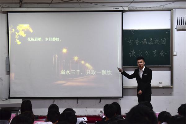 为响应团中央青少年新世纪读书计划,开阔大学生的视野,增长知识,培养良好的自学能力和阅读能力,以“多读书,读好书,会读书”为宗旨的学院品牌文化活动——“书香满溢校园”读书分享会于3月29日下午在一号教学楼一阶教室举办。环境学院团总支书记张恬参加了本次活动。