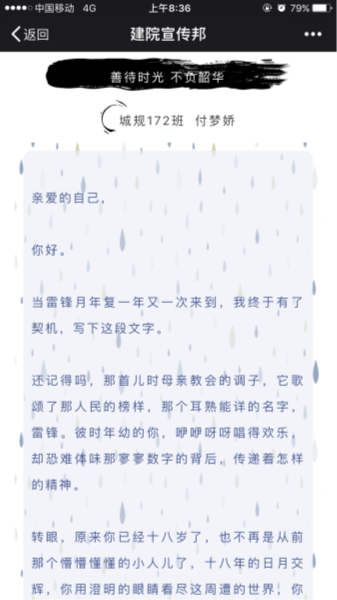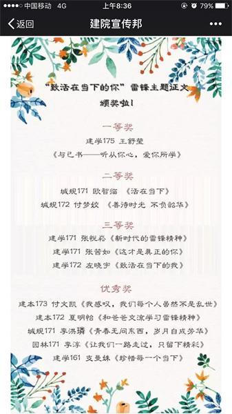 本次活动通过雷锋精神引导学生珍惜今天,珍惜现在,不驰于空想,不骛于虚声,快乐活在当下。学院的同学们积极响应本次活动,优秀文章层出不穷,将比赛推向高潮。最终,建学175班的王舒莹同学的《与己书——听从你心,爱你所学》以优秀的写作手法和深刻的作品内涵夺得一等奖,在她的文章中“感叹岁月易逝,那么岁月流转成诗的美丽你注定会错过,或许终会有遗憾,或许总是有不完美。我不想你过分关注时间甚至'斤斤计较',更不想你太过执拗于探寻时间所值,而忘记了身在其中感受其流逝的那份无法言说的美好。去享受生活吧,去感受去记住,不必多么荣耀多么完美,做你自己不负心安,就已是岁月静好”一段,道出了深刻的生活哲理,令人深思。