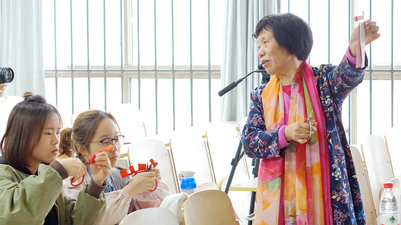 在讲座中,王德蕊老师详细介绍了剪纸艺术的价值、创艺与发展、剪纸题材、剪纸方法等相关知识。她利用图文结合的形式,让同学们体会到了博大精深、精彩绝伦的剪纸文化。通过现场教学,对剪纸的步骤顺序和常用符号进行了示范讲解。青岛市手工艺协会西海岸新区分会的剪纸艺术家们协助教学,将自带的剪刀、纸张分发给同学们并进行一对一的剪纸技艺指导。讲座现场气氛活跃,艺术家和同学们专心创作,每一步都细致认真,小有所成的成就感充满全场。王德蕊老师语重心长地说,希望通过这次活动让大家真正学习到剪纸艺术,并且可以更好地将这一艺术传承下去。