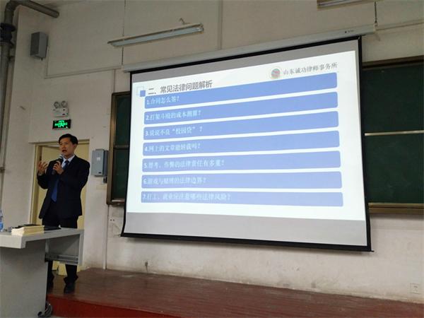 5月16日下午,商学院在长江路校区二号教学楼阶402教室举办第一期"商说商道"论坛。党总支副书记董兰国出席活动,山东诚功律师事务所律师高松担任主讲嘉宾,活动由辅导员刘奕主持。