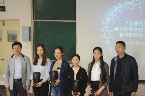 5月16日下午,管理工程学院于二教阶401举办第三届“金现代杯”就业创业文化节开幕式暨考研经验交流会,管理工程学院党总支副书记于利俊,金现代信息产业股份有限公司耿毅,学院辅导员仝莉莉、邹佳欣、马小童、陈永亮参加了本次活动。活动由陈永亮主持。