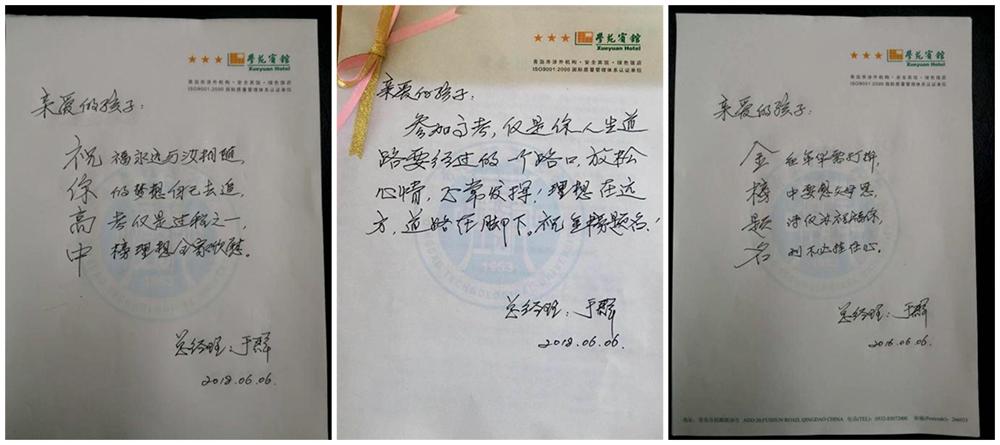 6月7、8、9日高考,不少家长为孩子预定宾馆房间作为休息场所,宾馆经理于群亲手书写鼓励的话语,一张张带有学苑宾馆logo的小卡片缓解了考生的紧张和不适,也寄托着理工人对考生的关爱、支持与鼓励,许多家长纷纷通过前台向学校表达感激之情,对宾馆细致入微的贴心服务表示赞赏。