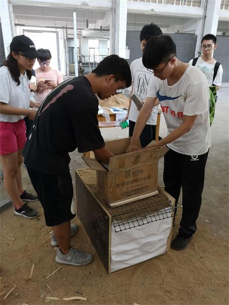 比赛分为报告书设计、实践操作两个阶段。决赛分为挡墙制作、挡墙装配和模型加载三个环节。比赛过程中选手严谨认真,争分夺秒进行实验。各参赛队使用大赛举办方统一提供的白卡纸、牛皮纸、胶带和工具等进行面板制作;进入挡墙装配环节,各参赛队利用砂箱、粗砂和已装配好的面板建造完整的挡土墙模型;最后进入加载环节,该环节分为竖向加载和水平加载,其中竖向加载最大荷载为40kg。最终,大赛评委会综合考虑牛皮纸面积、装配时间、建造时间、竖向加载和水平加载计算出决赛成绩,评选出一等奖1组、二等奖3组、三等奖4组。