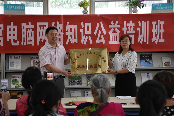 6月29日上午,土木工程学院志愿服务基地挂牌仪式在青岛市市北第二图书馆举行。土木工程学院党总支副书记邵先锋、市北区第二图书馆赵馆长、“绿丝带”健心协会指导老师刘欣然出席挂牌仪式,市北第二图书馆老年大学负责人李老师主持,老年大学学员及绿丝带健心协会三十余名成员参与本次活动。
