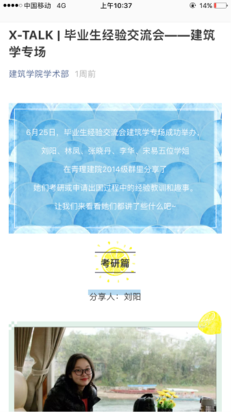 建筑学、城乡规划、区规、风景园林、建筑学(中外合作办学)的各位学姐学长,纷纷在建筑与城乡规划官方微信公众号发表并总结了综合自己专业特点的学习经验,或详细讲解了在自己的专业学习过程中遇到的各类难题及其解决办法。留学米兰理工大学的建学133的宋易建议大家积极竞赛,在竞赛中激发自己思考问题的深度和广度。除了总体的大学学习规划之外,优秀的毕业生们还分享了不同专业里各学期的小科目学习及考试经验以及英语学习的方法及其重要性,考取同济大学的城规131李博涵提出了英语的去前期积累和后期理解,建议同学们英语学习可以分专题整理出学习模板。在比较受关注的考研方面,毕业生们客观地阐述了自己所报考的学校的历年招生情况、出题特点等,如考取上海海洋大学的区规131崔明远叙述了自己四门考试如何从基础复习到冲刺刷题,强调了坚持的重要性,也从不同角度详细介绍了自己在考研期间的各学科学习经验及应当注意的一些学习方法问题,这些宝贵的经验给予了同学们丰富的信息资源,也为同学们今后的学习指明了方向。