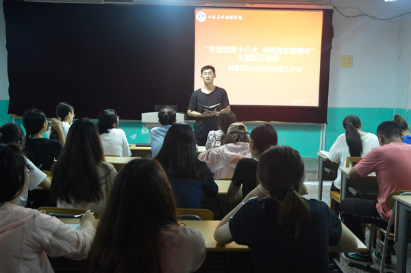 为积极响应校团委关于开展“牢记时代使命,书写人生华章”主题团日活动的号召,学习宣传贯彻落实习近平新时代中国特色社会主义思想和团的十八大会议精神,坚定理想信念。人文与外国语学院团总支在7月11日晚一教527组织开展“学思践悟十八大,争做有志新青年”主题团日活动暨暑期社会实践部署工作会。人文与外国语学院辅导员马松、团总支委员会成员、各班级团支书参加会议。
