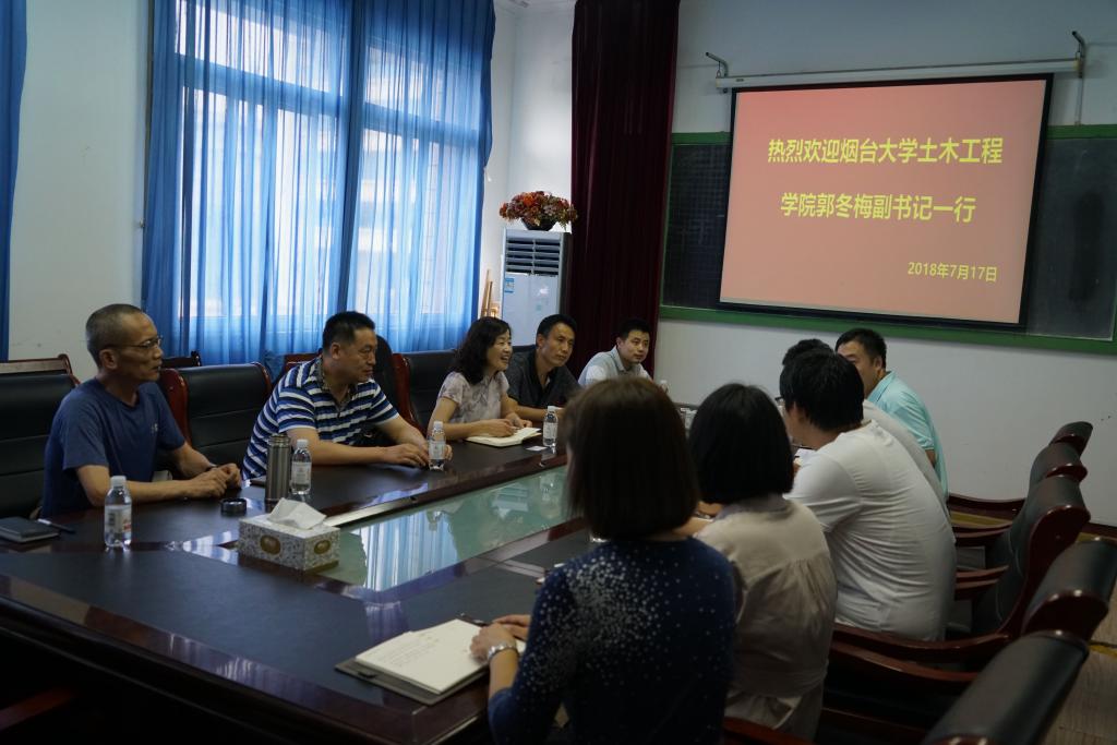 7月17日下午,烟台大学土木工程学院党总支副书记郭冬梅一行6人来365完美土木工程学院交流考察。土木工程学院党总支书记曲成平、副书记邵先锋、学院辅导员、教学秘书老师等接待了来访客人。