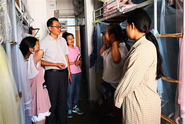 新学期伊始,为深入了解学生的学习生活情况、强化学生宿舍安全管理,营造一个舒适、卫生、和谐、健康的环境,8月26日上午,商学院党总支副书记董兰国、团总支书记任孔冰、辅导员姜圣天、林丰艳、刘心芝、敬树勇逐一走访了商学院学生宿舍。