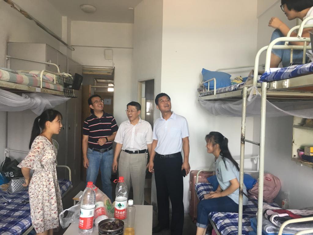 9月1日下午,学院党总支书记董典同、院长周玉国、党总支副书记曲良波及新生辅导员一行来到新生宿舍,看望2018级新生。董典同一行先后走访了A区男生宿舍和6号楼女生宿舍,认真查看了学生的住宿环境,询问学生所学专业、家庭情况、需要解决的困难等,关切的叮嘱同学们要注意身体,尽快熟悉环境,适应大学生活,并勉励同学们努力学习,提升综合素质,争做一个对社会有贡献的人。