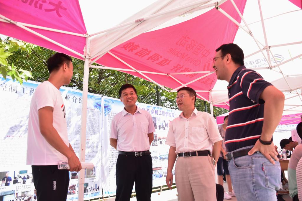 9月1日上午7:00,迎新工作准时开始。60名班助早已到达迎新现场,做好了迎接新生的准备,学院书记和院长高度重视迎新工作,同班助和辅导员一起迎接新生,报到现场井然有序,提前完成了1064名新生的报到工作。上午9:00,校领导来到了信控学院迎新现场,看望新生及迎新工作人员,对我院迎新工作的有序开展予以肯定。