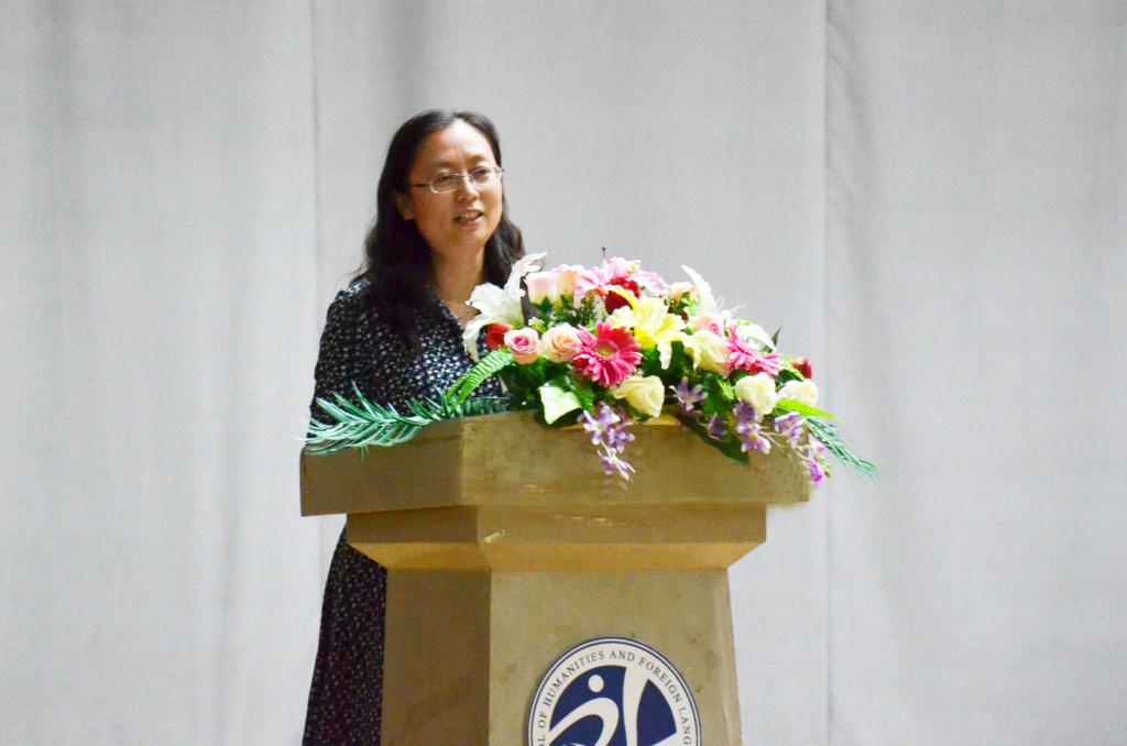会上,巩湘红代表学院全体教职员工对新生们的到来表示热烈欢迎,并对人文与外国语学院的历史发展、教师队伍、教学成就等作了详细介绍。随后,巩湘红以新生军训时期的第一印象作为引言,对新生给予了“青春有活力,热情有礼貌”的高度评价,并期望新生们能够在接下来的大学四年的生活中永远保持一份天真纯洁、积极开朗。接着她为同学们分析了人文学科,分析了如何学好一门语言,她对同学们循循善诱、谆谆教导,通过引用《年轻》中的一句话,教导新生们要勇于有梦、敢于追梦、勤于圆梦,惜青春美好年华,修炼兼容并包的思维、感知天下的精神永远保持一颗年轻的心。希望新生们建立正确的人生价值观,正视挫折和失败,以学为乐,养成思考的习惯,处理好诱惑和学习之间的矛盾,努力提升自我修养、丰富知识、锻炼能力,做一个"与太阳赛跑"的人。