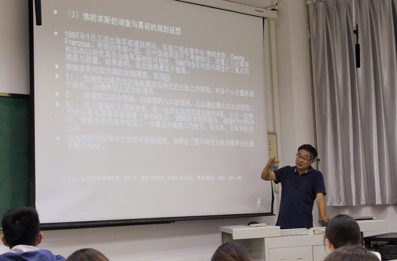 为使学生进一步了解青岛城市产生的背景及城市规划历史,回顾德租时期青岛的发展状况,9月27日下午,建筑与城乡规划学院在一教202教室举办《青岛德租时期的建筑与人文》专题讲座,本次讲座以“城市背景、城市规划”为主题,徐飞鹏教授担任主讲,与到场学生深入交流,讲述青岛城市发展进程。