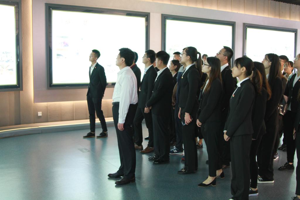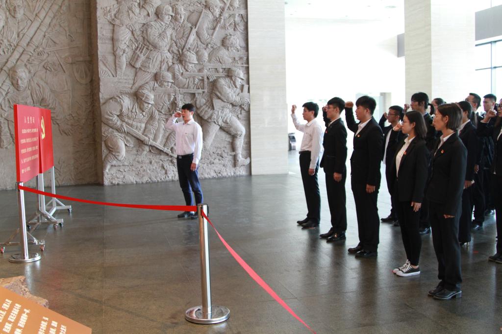 在沂蒙革命纪念馆大厅,李国涛宣读新发展预备党员名单,全体预备党员面对党旗,举起右拳,庄严宣誓,铮铮誓言表达对党的忠诚和为共产主义事业奋斗的决心。宣誓结束后,全体党员参观了沂蒙革命纪念馆。在纪念馆内,一幅幅内容翔实图片资料,一件件历史文物,记录了沂蒙人民爱党拥军、舍生忘死、无私奉献的感人事迹。抚养革命后代的“沂蒙母亲”王换于,用乳汁救活伤员的“沂蒙红嫂”明德英,扛起门板用身体为部队架起火线桥的“沂蒙大姐”李桂芳,一个个感人至深的人物事迹使全体党员进一步深刻理解了“爱党爱军、开拓奋进、艰苦创业、无私奉献”的沂蒙精神。
