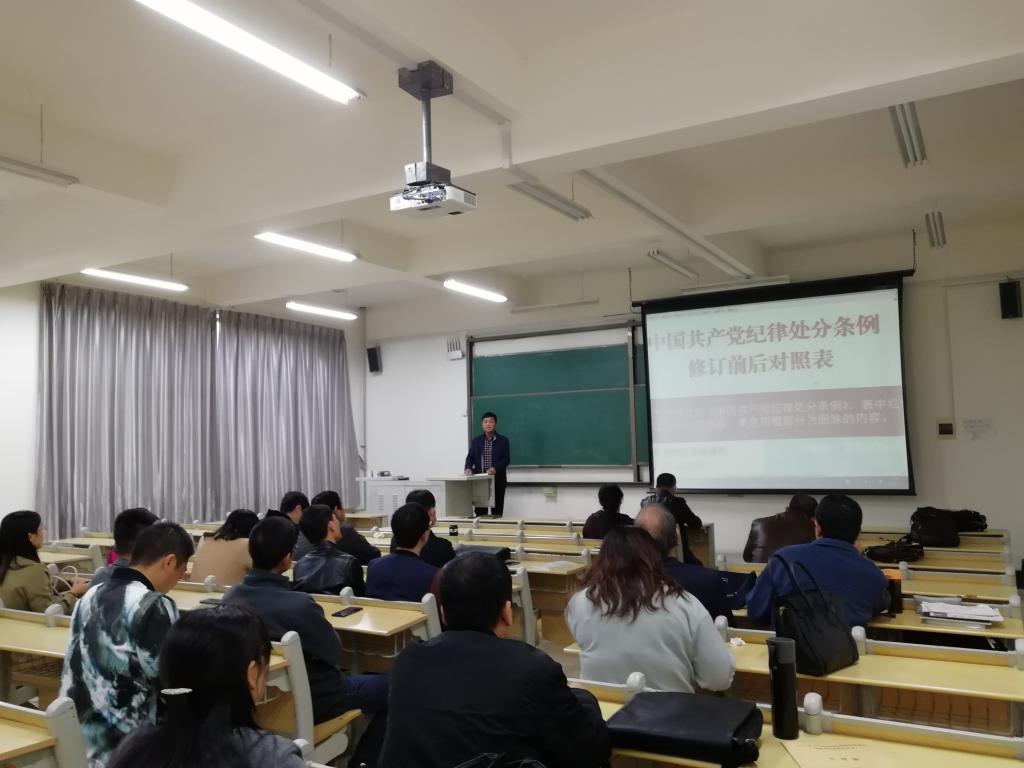 活动现场,董典同带领大家学习了新修订的《中国共产党纪律处分条例》,解读了《条例》修订的时代背景、历史意义和特点,逐条对照讲解了《条例》的主要内容,并对《条例》新增加11条、修改65条,整合2条的内容进行了重点学习和讨论。同时也强调,高校教师承担着学校“三全育人”的主要角色,应具有正确的价值观和育人观,要努力争做“四有好老师”,真正做到教育的“四个回归”。