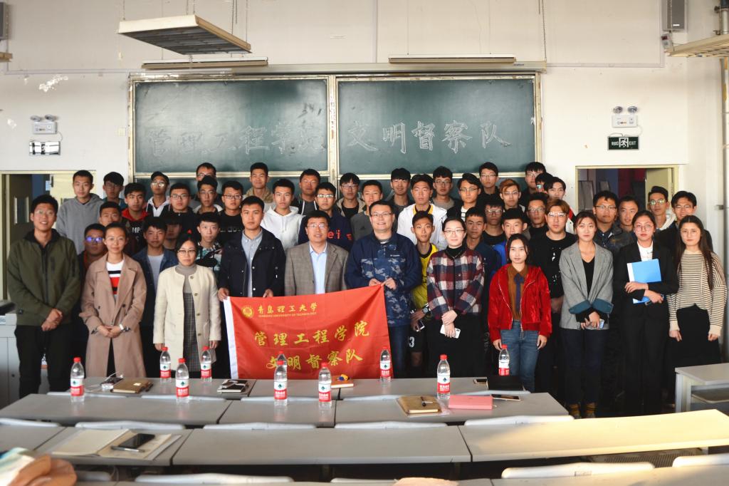 为加强学生文明素养和纪律观念,提高公寓卫生安全水平,建设文明和谐有序的公寓文化,10月31日下午,管理工程学院在阶401教室举办文明督察队成立大会,党总支副书记于利俊,辅导员邹佳欣、马小童、陈永亮、王云霞、张翔,学生会常委及各年级代表出席了本次大会。学生会生活部副部长王楚担任大会主持人。