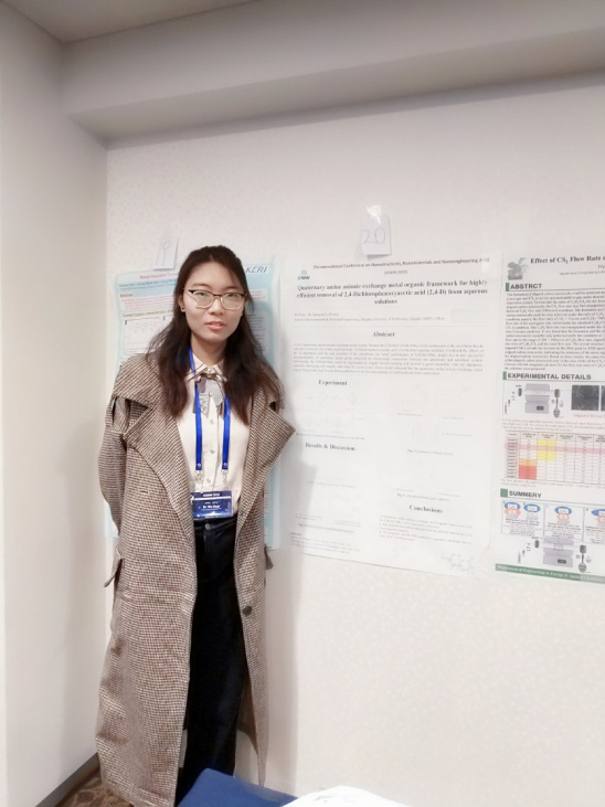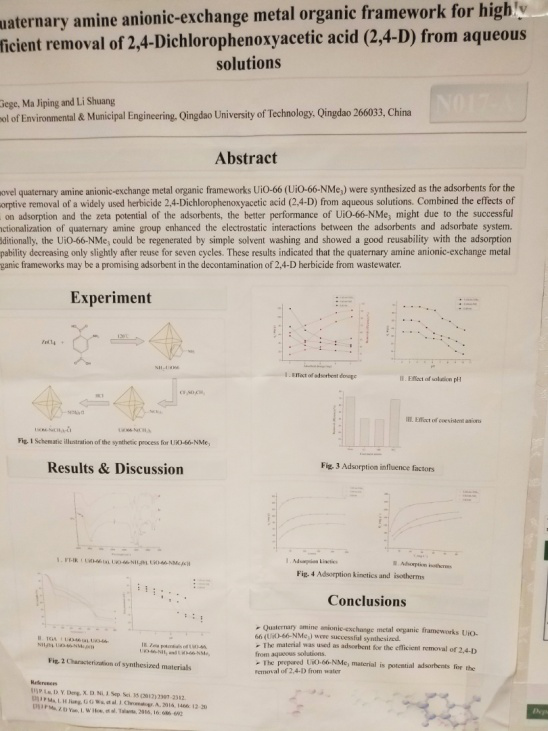 吴阁格同学的相关研究成果“Quaternary anionic-exchange metal organic framework for highly efficient removal of 2,4-Dichlorophenoxyacetic acid (2,4-D) from aqueous solutions(季氨基改性的阴离子交换金属有机骨架材料用于水中2,4-D除草剂的吸附去除)”,以墙报的形式进行了汇报展出,期间与对该研究成果感兴趣的各位专家学者进行了友好的交流与讨论,开阔了自己的研究思路,相信此次会议的参加会对日后在环境纳米材料领域的研究工作具有重要的启发及指导意义。