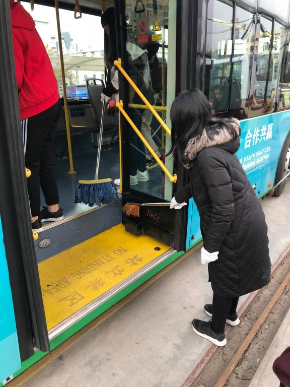本次活动组织严密,准备充分。清晨,同学们经过半小时的徒步行走,到达了公交车四方区总站。在向保洁人员咨询工作经验后,同学们拿起各种各样的卫生工具,分组对公交车内外环境进行清洁。随后同学们又根据工作人员指示,合理分配参与人员,进行场站周围的杂草清理。过程中,同学们积极主动进行劳动,勇于承担责任,注重合作。冬天的寒冷没有阻挡同学们志愿服务的热情,大家也在过程中充分体会到了平日进行清理的工作人员的不容易。培养了吃苦耐劳的精神。活动结束后,大家表示在本次活动中收获颇丰,并期待再次举办类似活动,帮助在寒冷冬日依旧坚持在工作岗位的保洁人员减轻负担。
