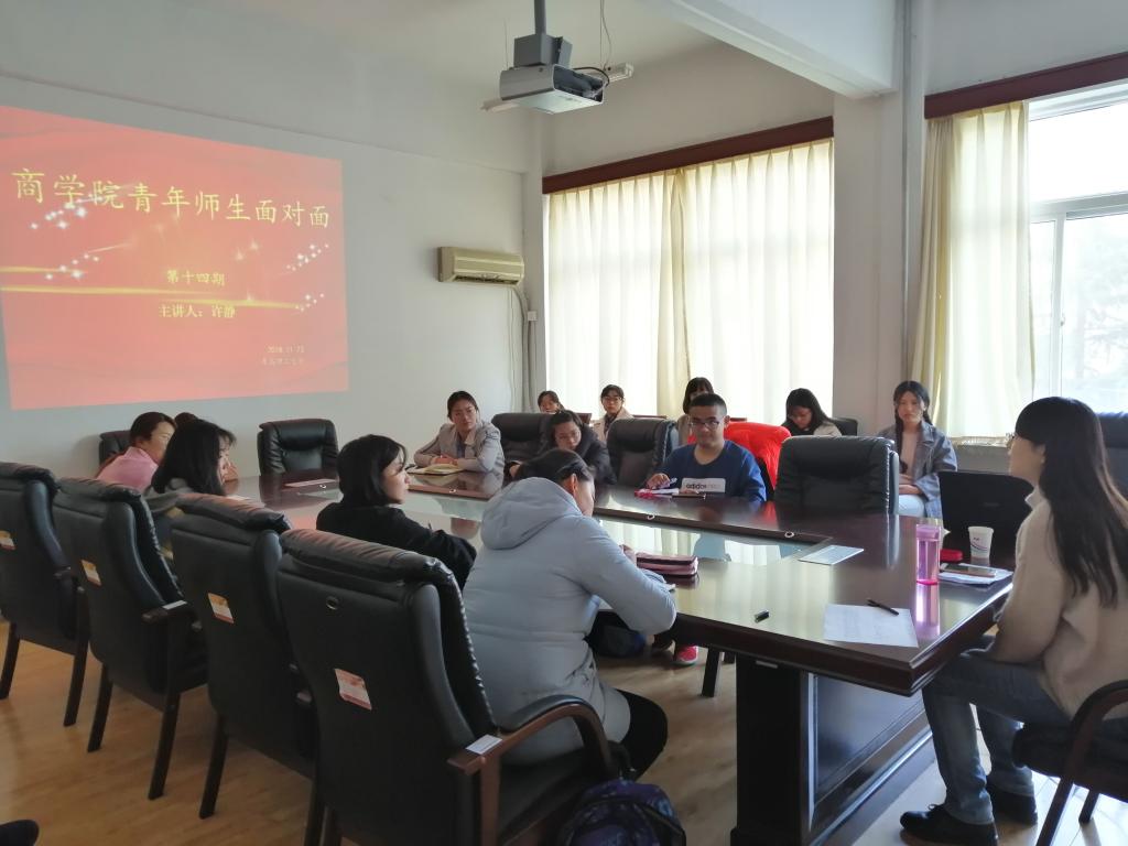 近日,商学院于长江路校区一教318室举办第十四期“青年师生面对面”活动,本次活动由国际商务教研室许静老师主讲,商学院20名学生参加。