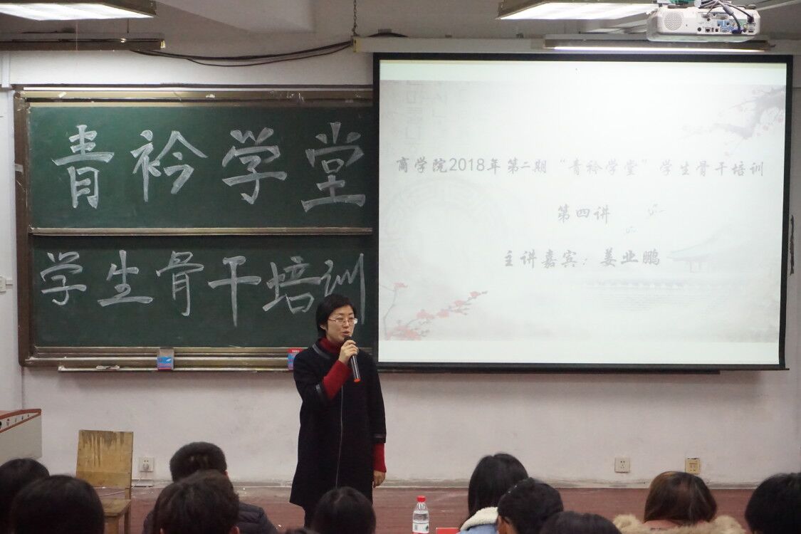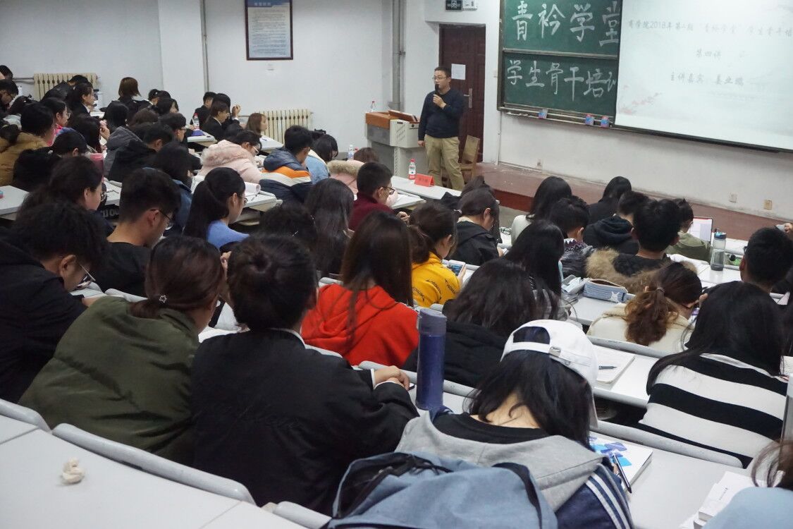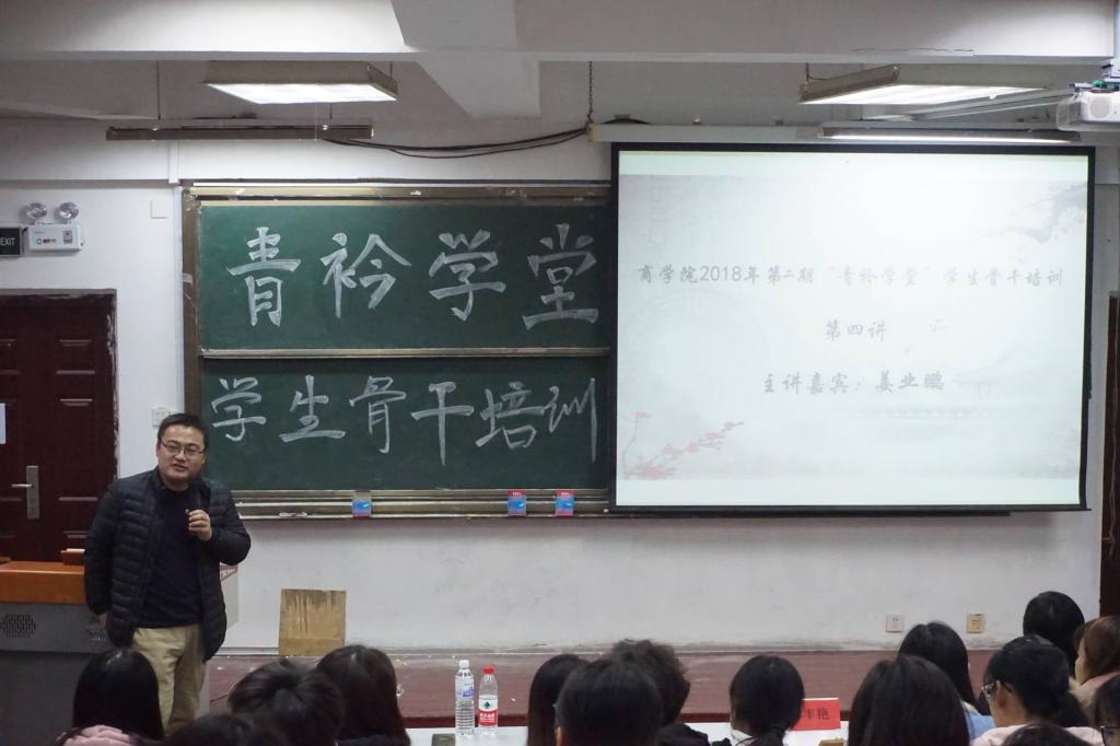 11月28日下午,商学院在长江路校区2号教学楼阶204举办2018年第二季第四期“青衿学堂”学生骨干培训,365完美体育09届优秀校友姜业鹏做主题报告,辅导员林丰艳主持,商学院主要学生干部共160余人参加培训。
