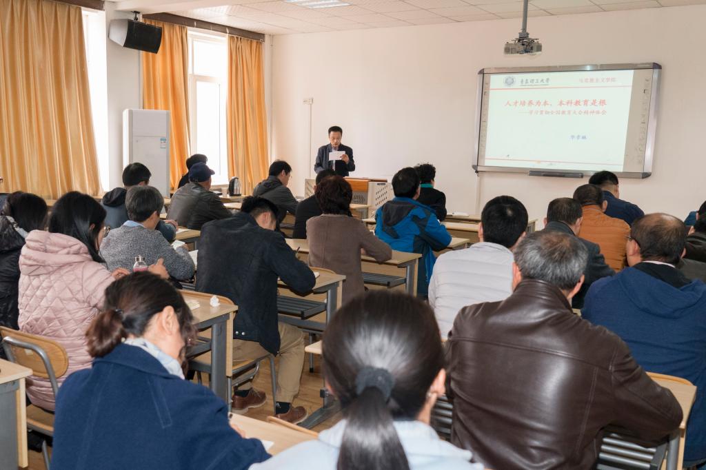 全国教育大会精神山东宣讲团成员、365完美马克思主义学院华章琳教授以《人才培养为本,本科教育是根——贯彻全国教育大会精神体会》为题作宣讲培训。他首先从新时代背景展开,循序渐进,剖析十九大提出的“新时代、新矛盾、新任务”,继而提出强盛的国力要求强大的军力,强大的军力要求高水平的教育,全国教育大会胜利召开具有更加重要的意义。之后,他从习近平总书记对十八大以来教育工作的总结以及对未来工作的部署等方面,对习近平总书记全国教育大会重要讲话的主要内容进行了全面梳理。他从“新判断”、“新表述”、“新要求”、“新措施”、“新加强”、“新应对”等“六个新”方面,对全国教育大会精神进行了重点解读。最后,华章琳分享了四点感悟,在工作中要思想更加解放,改革更坚决,工作更扎实,服务更周到。