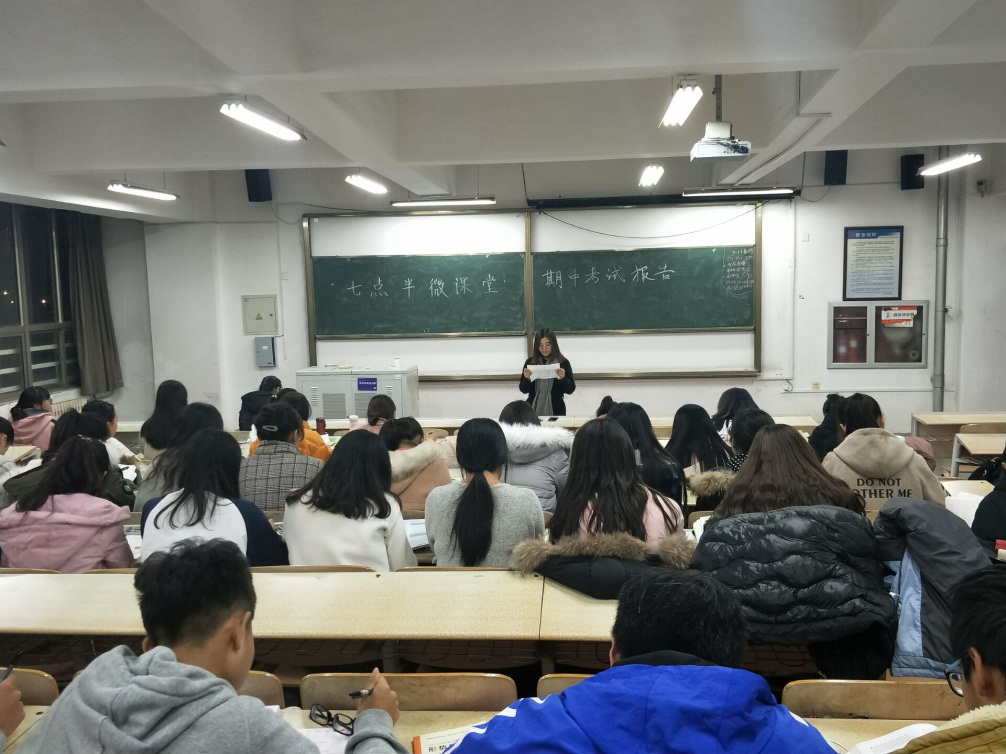 树立榜样,齐头并进。11月29日晚,商学院“七点半”微课堂第三讲在2018级新生各自习室开讲。本期微课堂以“期中总结和学习交流”为主题,首先,各班学习委员通报了本班的优秀率、及格率、年级排名等,并宣读了本班的学习计划,号召全班同学积极加入到班级学习计划中,形成合力,共同进步;接着,每个班的高数和英语考试高分者分别与大家交流了自己的学习经验,分享了具体明确的学习方法,全体学生听讲认真,表现出了极高的兴趣;最后,辅导员杨洪敏做总结,对取得优异成绩的学生提出表扬,并帮助成绩不理想的学生进一步认识到了自身存在的问题,鼓励大家不要气馁,要进一步严格要求自己,铺下身子踏实学习,多向身边的榜样看齐,形成“赶帮超”的学习氛围。